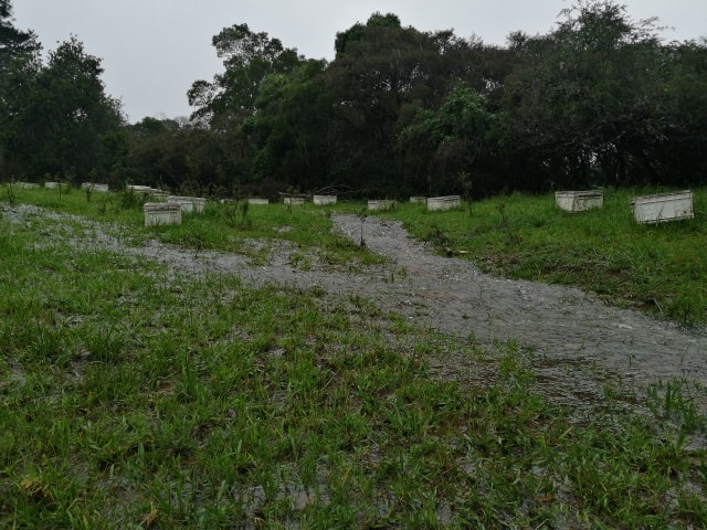 We also had an issue with rain, yes rain! After months of worrying about hives being damaged by fire it was actually water that caused the damage. One of our sites with Nucs became flooded and some nucs were as much as half submerged, amazingly despite being so water logged not a single one died!