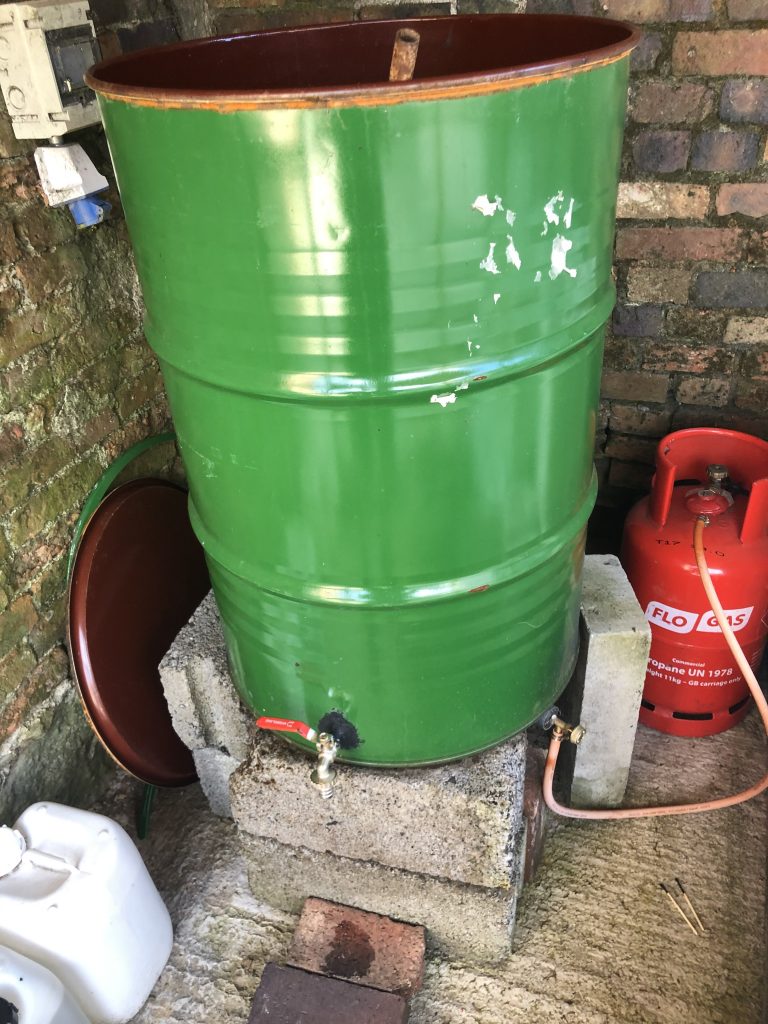 Any beekeeper will tell you that making sugar syrup is a sticky job and one not many enjoy. I’ve tried quite a few ways but have now settled on using a 200l tank over a gas burner. I fill it just over 1/3rd with water and let it get quite hot. I then add 175kg of sugar one 25kg bag at a time stirring regularly. Once it is mixed well I add thymol, a chemical that stops the syrup from going off when it is stored for a long time.